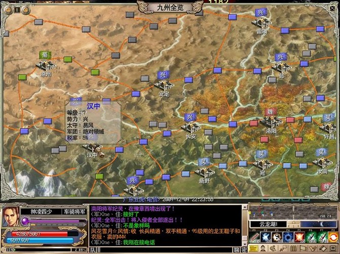 这次国战,风云星浪安排下旗延津口,复活黄巾山寨,集合邺东延津口跳口,以先阻止延津口敌军深入邺城首都,之后我国能将大军挥向襄阳主战场,力挑兴国全军。襄阳有了黄巾山寨复活点,又是练级专属城,一时成了兵家必争之地!从这几次国战来看,不难看出黄巾山寨是一个兵家重地。每次都是集军于黄巾山寨跳点,大决战于青龙道,再会师于襄阳雕像。让一时不起眼的襄阳,成了宝贝城,成了大家的旅游胜地,每次必到此一游。8点的钟声响起,延津口出来几个扰乱的兴军,其实我们早知道兴国主力军都在下坯和青龙道,但这时如果再改国战战略就只有乱了阵脚,与其临时添乱,还不如浪费一点点时间守一下邺东。清完邺东的零散兴军,大家立即回复活点,进攻襄阳。在青龙道大战几回合,我军毫无疑问拿下襄阳。不久徐州也失守。欣带领的军旗飘扬军团主力好像势在必夺徐州的样子,一直穿行于下坯与徐州东之间,让我军不得不分出一个主队去下旗下坯与之周旋。军旗团好像也知道这个秘技似的,也派了一个主力队一直来邺城搔扰。在这周旋中,不知不觉军旗团和守护团相互换首都,最后我军决定定都徐州,看看徐州的地图是不是更美丽,更能让人想起曾经的曾经。而汉中就在这邺城徐州来来往往的穿梭战中给兴国军队步步为营,最后被挺进雕像,汉中宣告沦陷!
